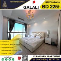 A fully furnished luxury apartment in Al Jalaali, 225 Bahraini dinars including taxes. This modern, fully furnished apartment is located in the Bahrain Investment Gateway area, opposite Al Jalaali. The apartment features a spacious bedroom, living room, fully equipped kitchen, large wardrobe, and stunning sea view. The building provides parking, elevator, and cleaning service. Easy access to Dilmunia, Amwaj Islands, Marassi, Dragon City, airport, seaport, and more.