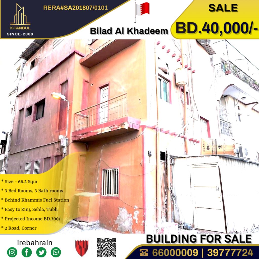 منزل صغير من ثلاثة طوابق للبيع في البلاد القديم، بسعر 40000 دينار بحريني. يقع هذا المنزل الصغير في البلاد القديم، ويتكون من 3 غرف، 3 حمامات، صالة، ومطبخ. مساحته 66.2 متر مربع، ويحتاج الى صيانة بسيطة. يقع بالقرب من محطة وقود خميس، السهلة، الزنج، وغيرها. السعر 40000 دينار بحريني