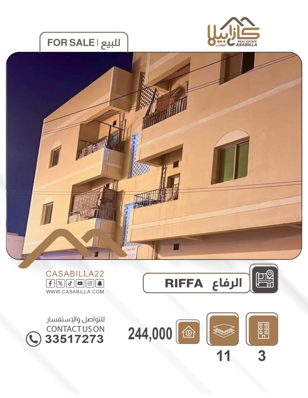 للبيع: مبنى استثماري في الرفاع الشرقي. الموقع: الرفاع الشرقي. المساحة: 230 متر مربع. السعر: 244,000 دينار بحريني. الدخل الحالي: 1,350 دينار بحريني شهرياً (مع إمكانية زيادة الدخل). عدد الطوابق: 3 طوابق. عدد الشقق: 11 شقة. تفاصيل كل شقة: غرفتي نوم، حمامين، مطبخ، صالة. إمكانية التوسعة: يوجد مساحة لبناء استوديو إضافي على السطح. الموقع: تقريباً في الرفاع، قريبة من مخبز دلمون. للتواصل.
