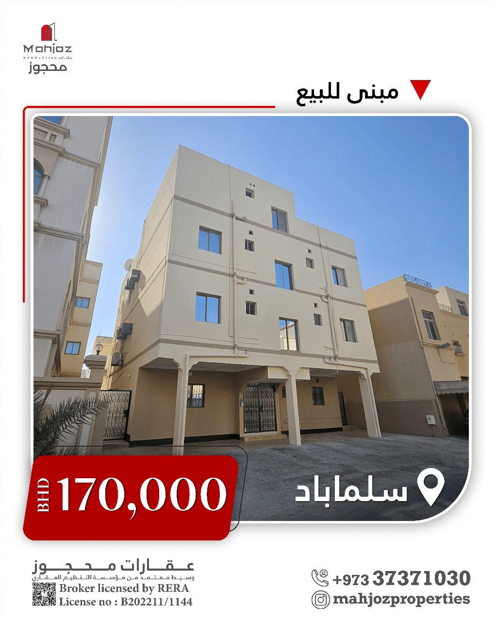 للبيع: مبنى في سلماباد يسمح بتملك الخليجي - 7 شقق - 4 شقق من غرفتين نوم، 3 حمامات - 1 شقة من 4 غرف نوم - 1 شقة من غرفة وصالة - مواقف سيارات - مساحة البناء 820 متر - مساحة الأرض 299 متر - الدخل الشهري 1100 دينار بحريني - المطلوب 170000 دينار بحريني (قابل للتفاوض) تواصل معنا لمزيد من المعلومات 00973 - عقارات محجوز mahjozproperties