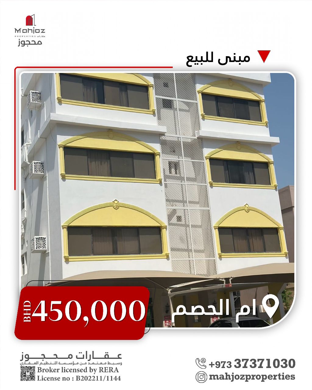 للبيع: بناية استثمارية في أم الحصم بالقرب من مستشفى ابن النفيس. تحتوي على 16 شقة، ومصعد، ومواقف سيارات. مساحة الأرض 333.8 متر مربع. الدخل الشهري 3,260 دينار بحريني. السعر المطلوب 450,000 دينار بحريني. تواصل معنا لمزيد من المعلومات على 00973 - عقارات محجوز.