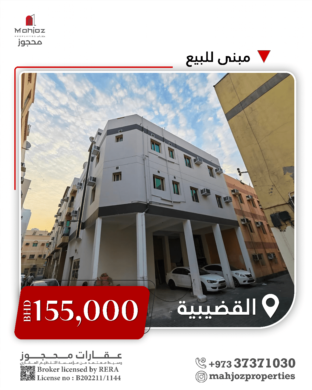 للبيع: بناية مميزة في القضيبية. 4 طوابق، 9 شقق: 4 شقق من غرفتين وصالة صغيرة ومطبخ وحمام؛ 4 شقق من غرفة ومطبخ وحمام؛ شقة واحدة من غرفة وصالة ومطبخ وحمام. مواقف سيارات، مخزن. مساحة البناء: 351 متر مربع. مساحة الأرض: 97.7 متر مربع على زاوية شارعين. الدخل الشهري: 1,530 دينار بحريني. 9 عدادات كهرباء. السعر المطلوب: 155,000 دينار بحريني (قابل للتفاوض). تواصل معنا لمزيد من المعلومات: 00973 - عقارات محجوز.