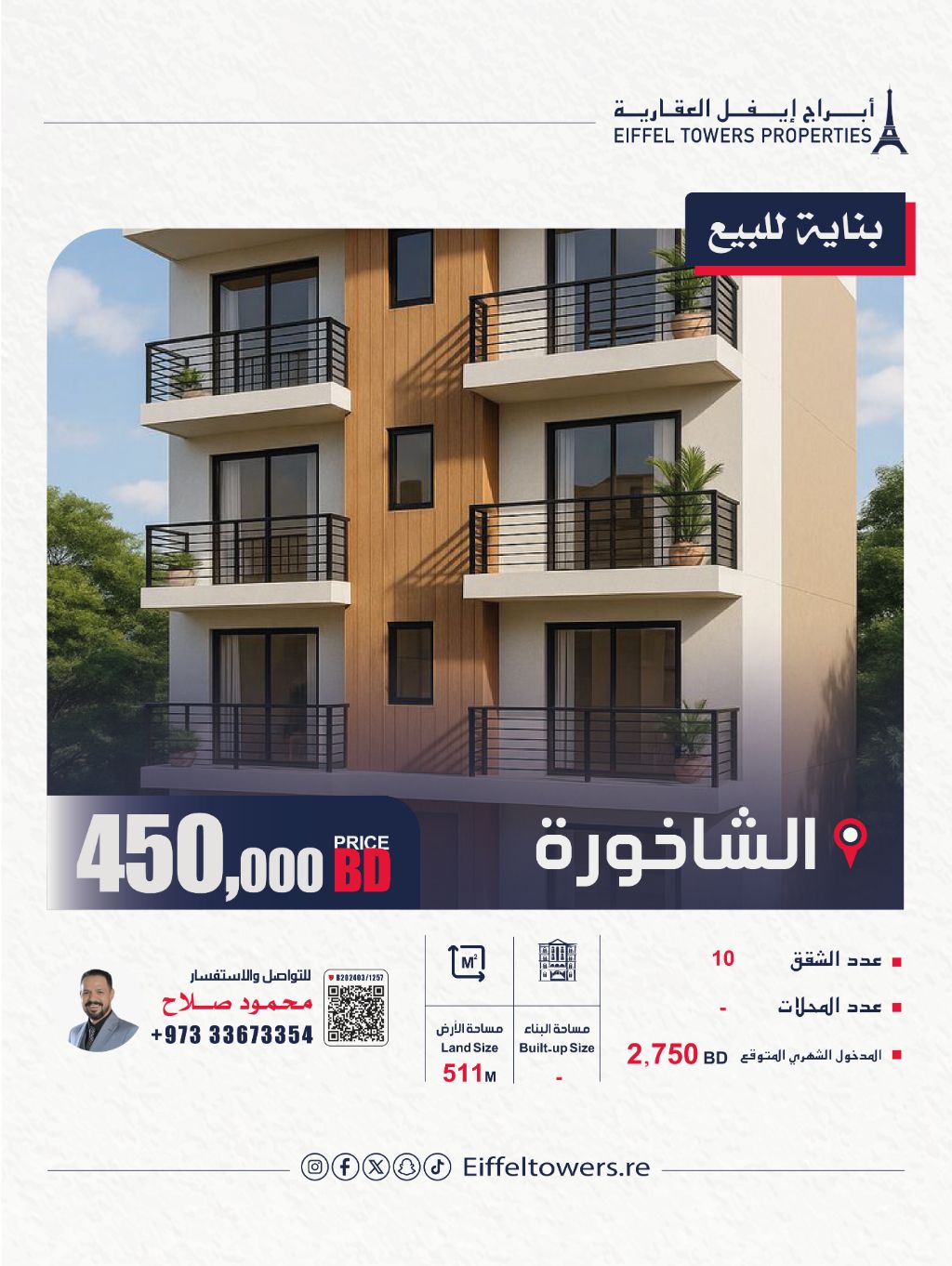 شركة أبراج أيفل العقارية تقدم للبيع بناية سكنية جديدة بتشطيبات فاخرة في الشاخورة. الموقع مميز بالقرب من مدرسة سانت كريستوفر، والبناء الحديث جاهز للاستثمار مباشرة. تتكون البناية من 10 شقق سكنية بتوزيع مريح، مصعد، ومواقف سيارات مخصصة. الميزات والتشطيبات تشمل تشطيبات راقية بجودة عالية، تصميم عصري يضفي فخامة على المكان، مداخل أنيقة، إضاءة حديثة، مواد بناء ممتازة، وضمان جودة في التنفيذ. تفاصيل الاستثمار تشمل الدخل الشهري.