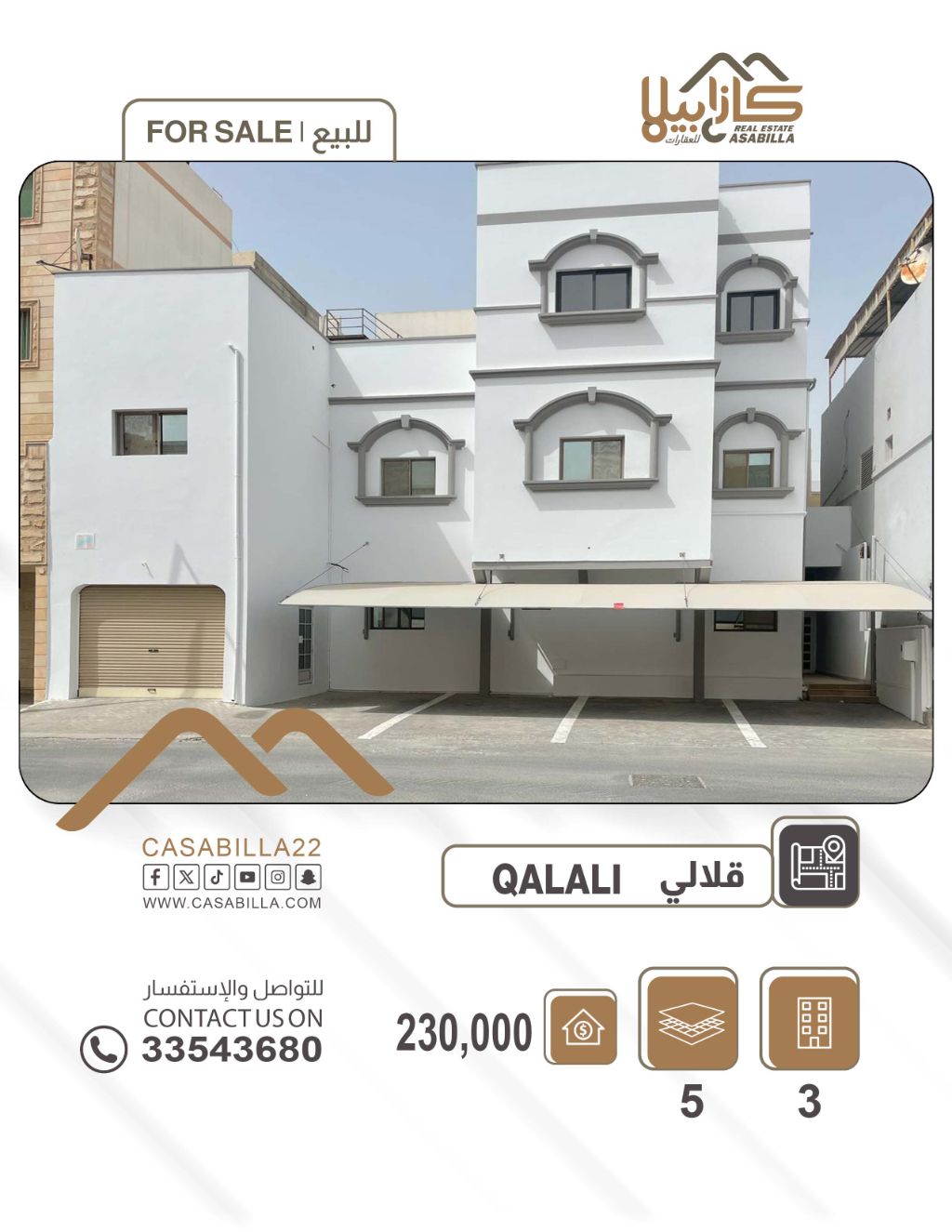 للبيع: بناية في قلالي على شارعين، تتكون من 6 شقق و4 محلات. مساحة الأرض: 325 متر مربع، مساحة البناء: 750 متر مربع. الطابق الأرضي: شقة واحدة بثلاث غرف. الطابق الأول: شقتان بوغرفتين + شقة استوديو واحدة. الطابق الثاني: شقة واحدة بوغرفتين + شقة استوديو واحدة. مجموع المدخول: 1650 دينار. السعر: 230 ألف دينار. للتواصل.