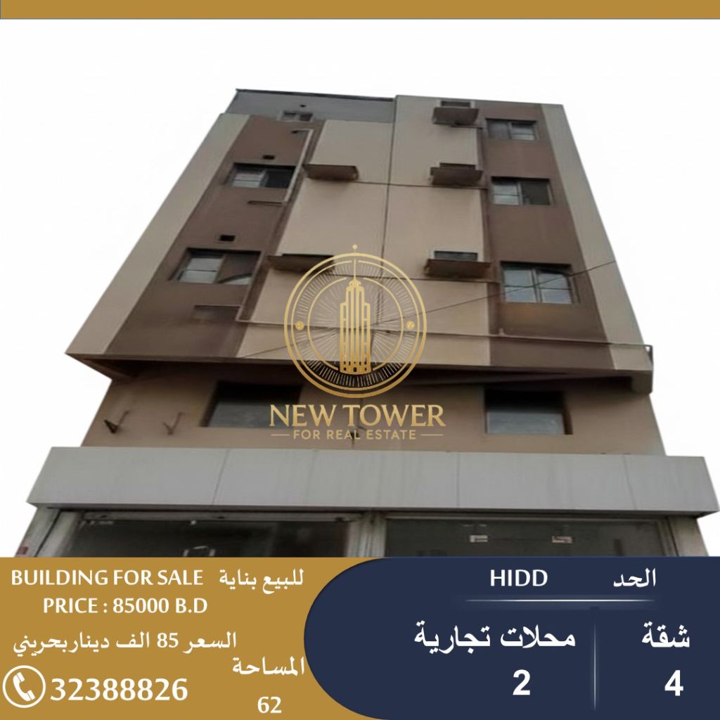 للبيع: بناية في الحد بموقع ممتاز. تتكون من 4 شقق و 2 محلات تجارية. المدخول الشهري 600 دينار بحريني. مساحة الأرض 62 متر مربع. السعر 85,000 دينار بحريني. للتواصل: مكتب البرج الجديد للعقارات.