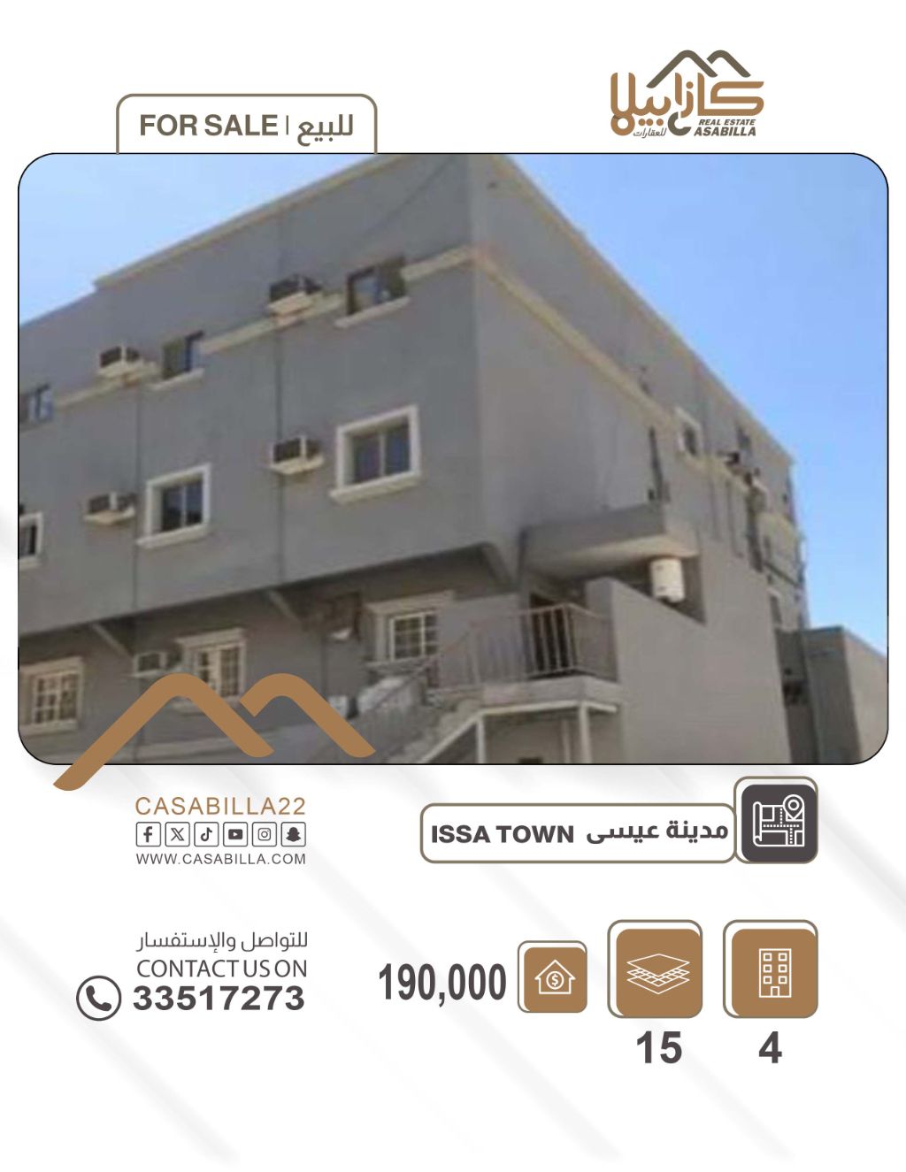 بناية استثمارية بمدخول مرتفع للبيع في مدينة عيسى - موقع استراتيجي. الموقع مدينة عيسى - بالقرب من دوار ديسكفري، موقع حيوي واستراتيجي بالقرب من كافة الخدمات. البناية مؤجرة بالكامل وتعتبر فرصة استثمارية جاهزة. تفاصيل ومواصفات المبنى: مساحة الأرض 336 متر مربع - عدد الطوابق 4 طوابق - إجمالي عدد الشقق 15 شقة - حالة المبنى مؤجر بالكامل. تقسيم الشقق الداخلي: 10 شقق مكونة من غرفتين وصالة وحمام ومطبخ.