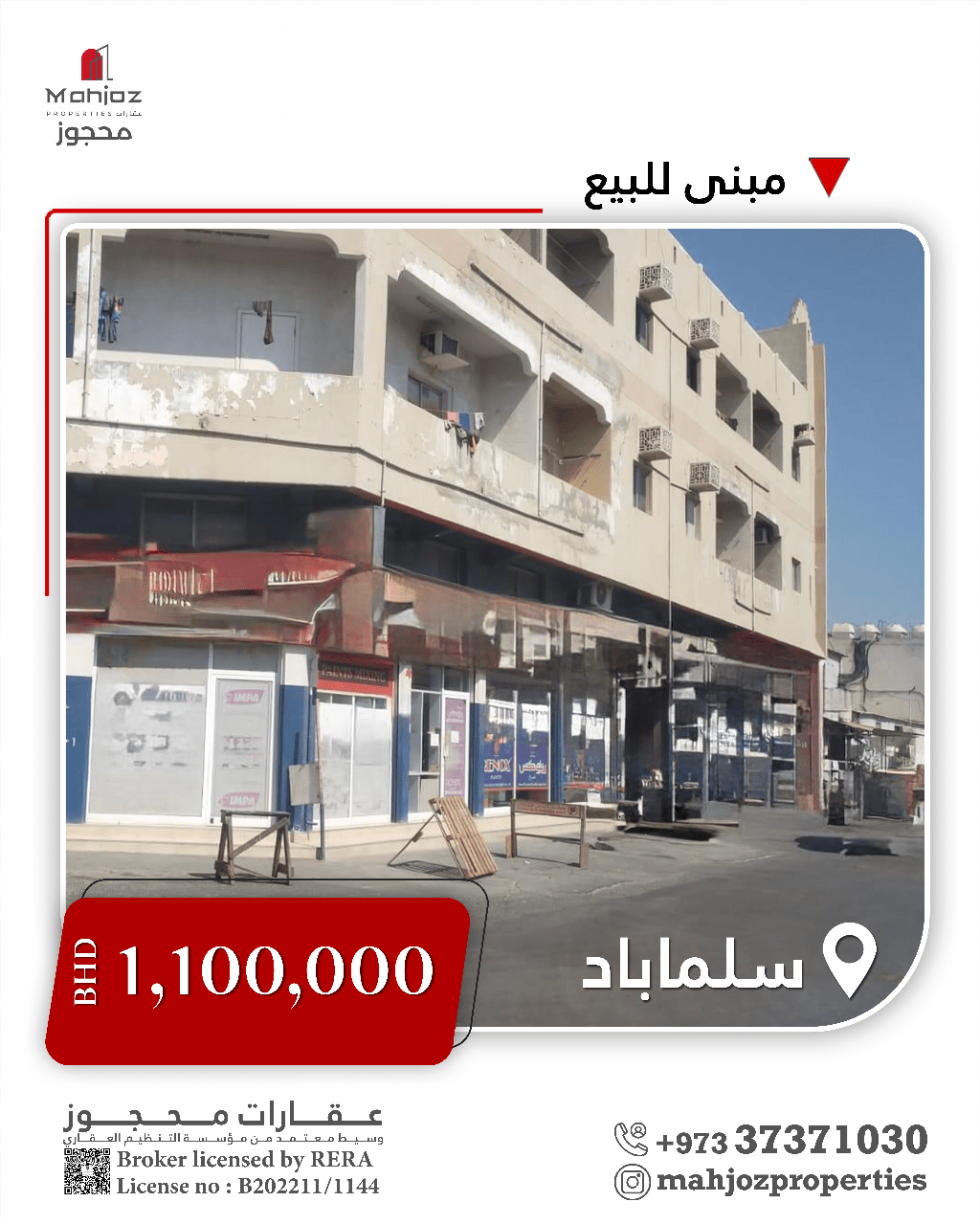 للبيع: مبنى سكني تجاري في سلماباد من 20 طابقاً. كل طابق متر واحد من 18 شقة - 16 شقة غرفتين وصالة ومطبخ وبعضها حمام واحد أو حمامين أو ثلاثة حمامات - 2 شقة غرفة وصالة ومطبخ وحمام. مساحة الأرض 2050.44 متر مربع. للمبنى 3 مداخل، وللمستودع مدخلان. بعض الشقق والمحلات غير مؤجرة. الدخل في حال التأجير الكامل 7120 دينار بحريني. السعر المطلوب 1,100,000 (قابل للتفاوض). تواصل معنا لمزيد من المعلومات: 00973 - عقارات محجوز.