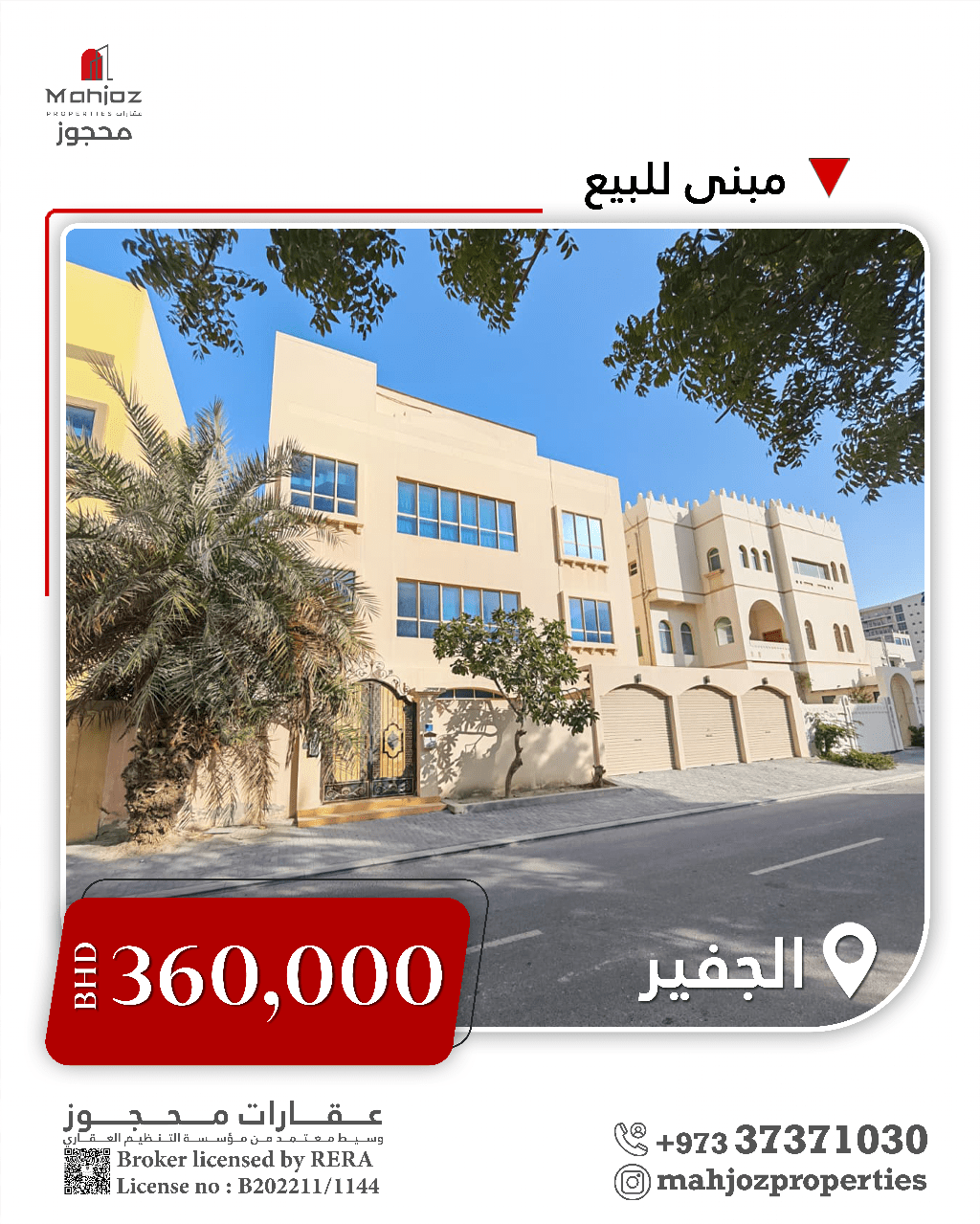 للبيع: مبنى في الجفير - 3 شقق كبيرة - شقة استوديو على السطح - مساحة الأرض 434 متر مربع - مصعد - بركة سباحة - المطلوب 360 ألف دينار بحريني. تواصل معنا لمزيد من المعلومات 00973 - عقارات محجوز mahjozproperties عقارات البحرين أرض - للبيع المنامة البحرين