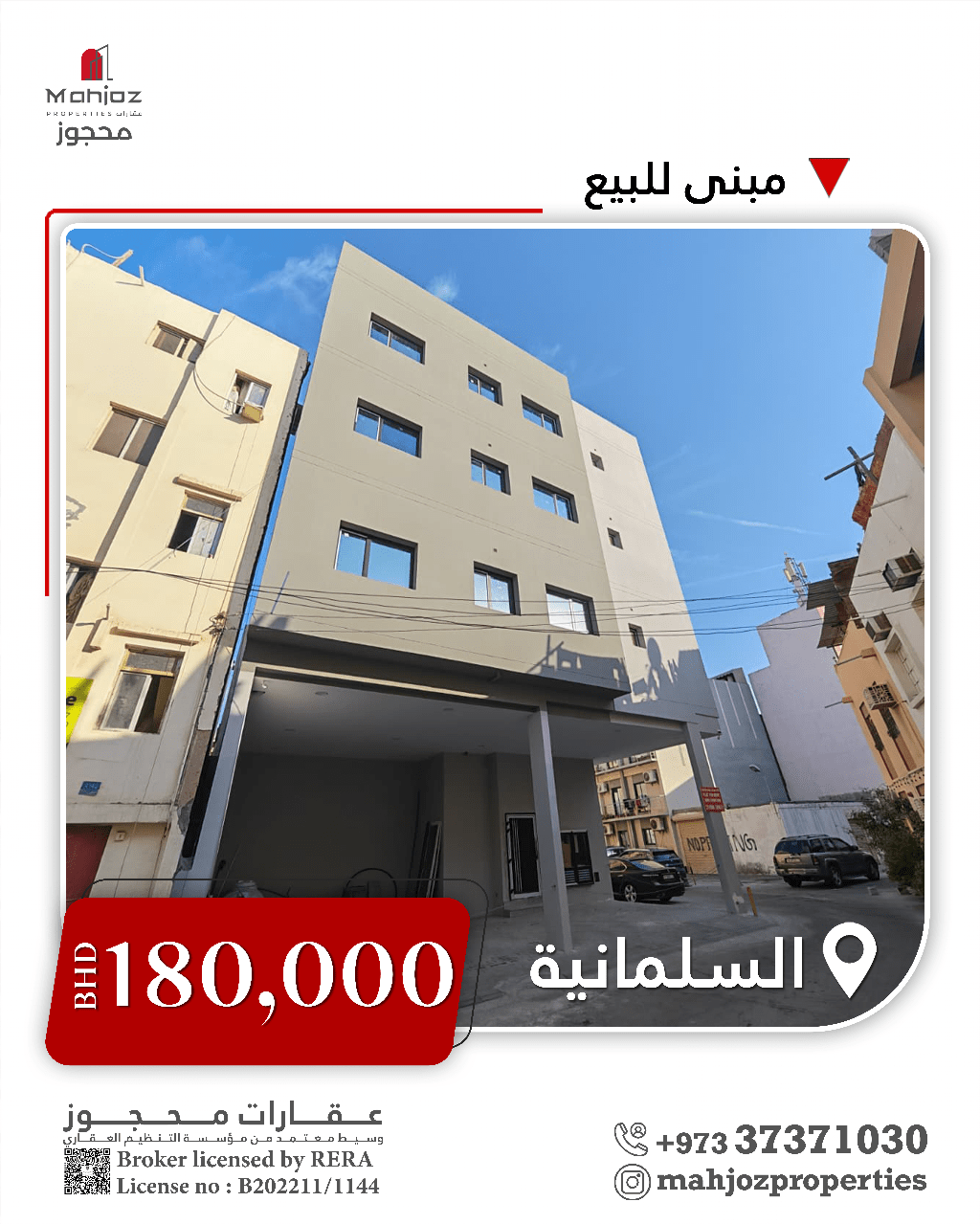 للبيع: بناية جديدة في السلمانية بمحاذاة مجمع السلمانية الطبي - 7 شقق - مواقف سيارات - من غرفة وحمام وصالة ومطبخ - مساحة البناء 338 متر مربع - مساحة الأرض 79.1 متر مربع - الدخل الشهري 1050 دينار بحريني (شيك واحد) - الكهرباء على المستأجر - المطلوب 180 ألف دينار بحريني (قابل للتفاوض). تواصل معنا لمزيد من المعلومات 00973 - عقارات محجوز Mahjoz Properties عقارات البحرين أرض - للبيع.