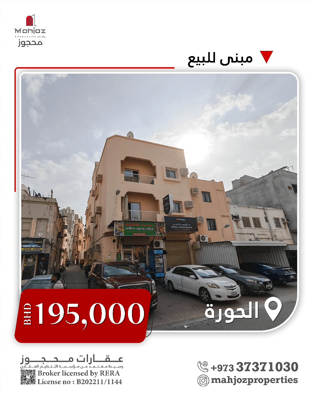 للبيع: بناية في الحورة 2، تحتوي على محل تجاري واحد، 11 شقة، 10 عدادات ماء، و10 عدادات كهرباء. مساحة الأرض 153 متر مربع، ومساحة البناء حوالي 489 متر مربع. السعر المطلوب 195,000 دينار بحريني. تواصل معنا لمزيد من المعلومات على 00973 - عقارات محجوز (Mahjoz Properties)، عقارات البحرين، أرض - للبيع، المنامة، البحرين.