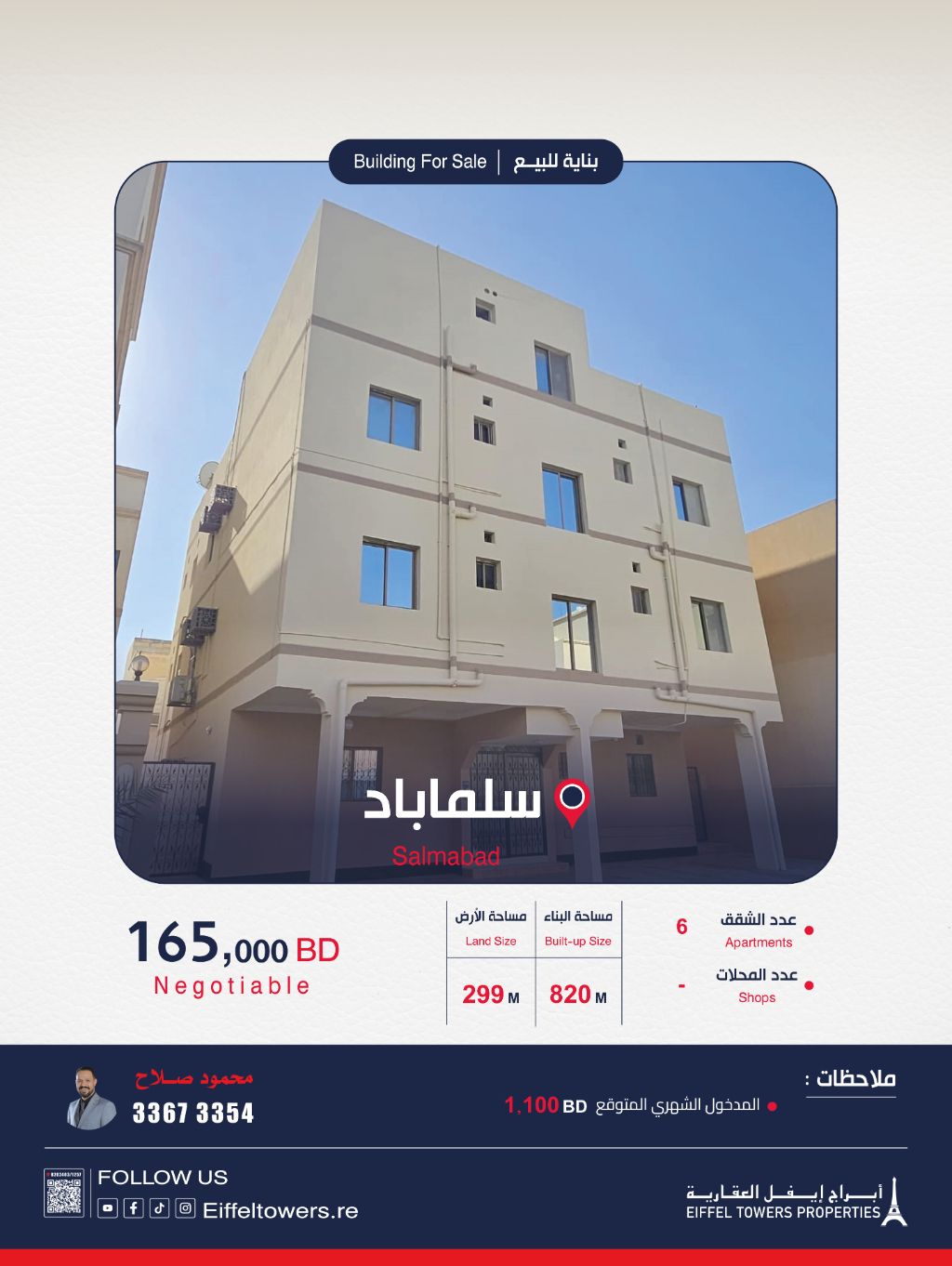 شركة أبراج أيفل العقارية للبيع: بناية في سلماباد بمساحة أرض 299 متر مربع ومساحة بناء 820 متر مربع. تتكون من 6 شقق بإجمالي دخل إيجاري 1100 دينار بحريني. الدور الأرضي يحتوي على شقة كبيرة مكونة من 4 غرف نوم و3 حمامات وصالة كبيرة ومطبخ كبير. الدور الأول يحتوي على شقتين، كل منهما مكونة من 2 غرفة نوم و3 حمامات وصالة ومطبخ. الدور الثاني يحتوي على شقتين، كل منهما مكونة من 2 غرفة نوم و3 حمامات وصالة ومطبخ. الدور الثالث يحتوي على شقة استوديو. سعر البيع 165,000 دينار بحريني. للتواصل: محمود صلاح، eiffeltowers-re.