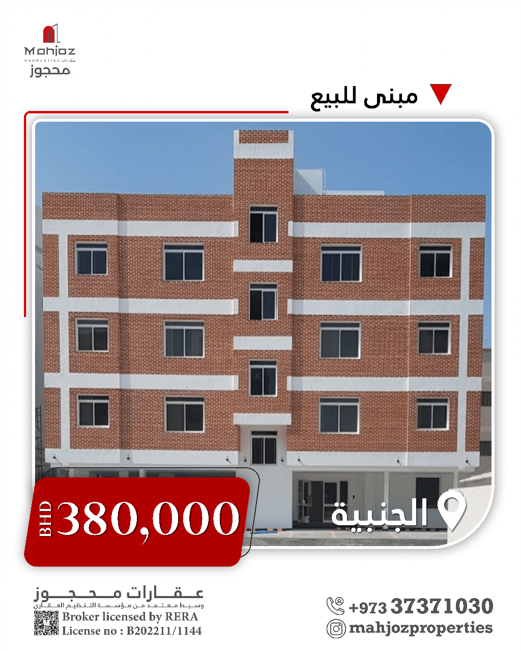 عقارات محجوز تقدم مبنى للبيع في الجنبية - 11 شقة - مصعد - مواقف سيارات - غرفة حارس - مساحة الأرض 454 متر مربع - الدخل الشهري 2200 دينار - 11 عداد كهرباء - المطلوب 380 ألف دينار بحريني. تواصل معنا لمزيد من المعلومات 00973 - عقارات محجوز mahjozproperties عقارات البحرين أرض - للبيع المنامة البحرين.