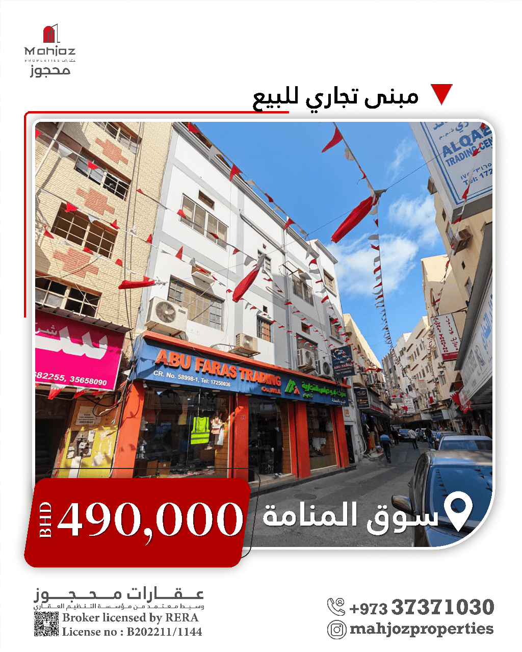 عقارات محجوز تقدم مبنى تجاري للبيع في سوق المنامة القديم سوق الجملة. فرصة عقارية مميزة بمساحة أرض كبيرة وموقع في قلب سوق المنامة القديم - معرض تجاري كبير - مخزن - 13 شقة - مساحة الأرض 527.1 متر مربع - 15 عداد كهرباء - الدخل الشهري الحالي 2100 دينار (الدخل الكلي لا يقل عن 3500 دينار) - متبقي 8 شقق غير مؤجرة - المطلوب 490 ألف دينار بحريني (قابل للتفاوض). تواصل معنا لمزيد من المعلومات على الرقم 00973.
