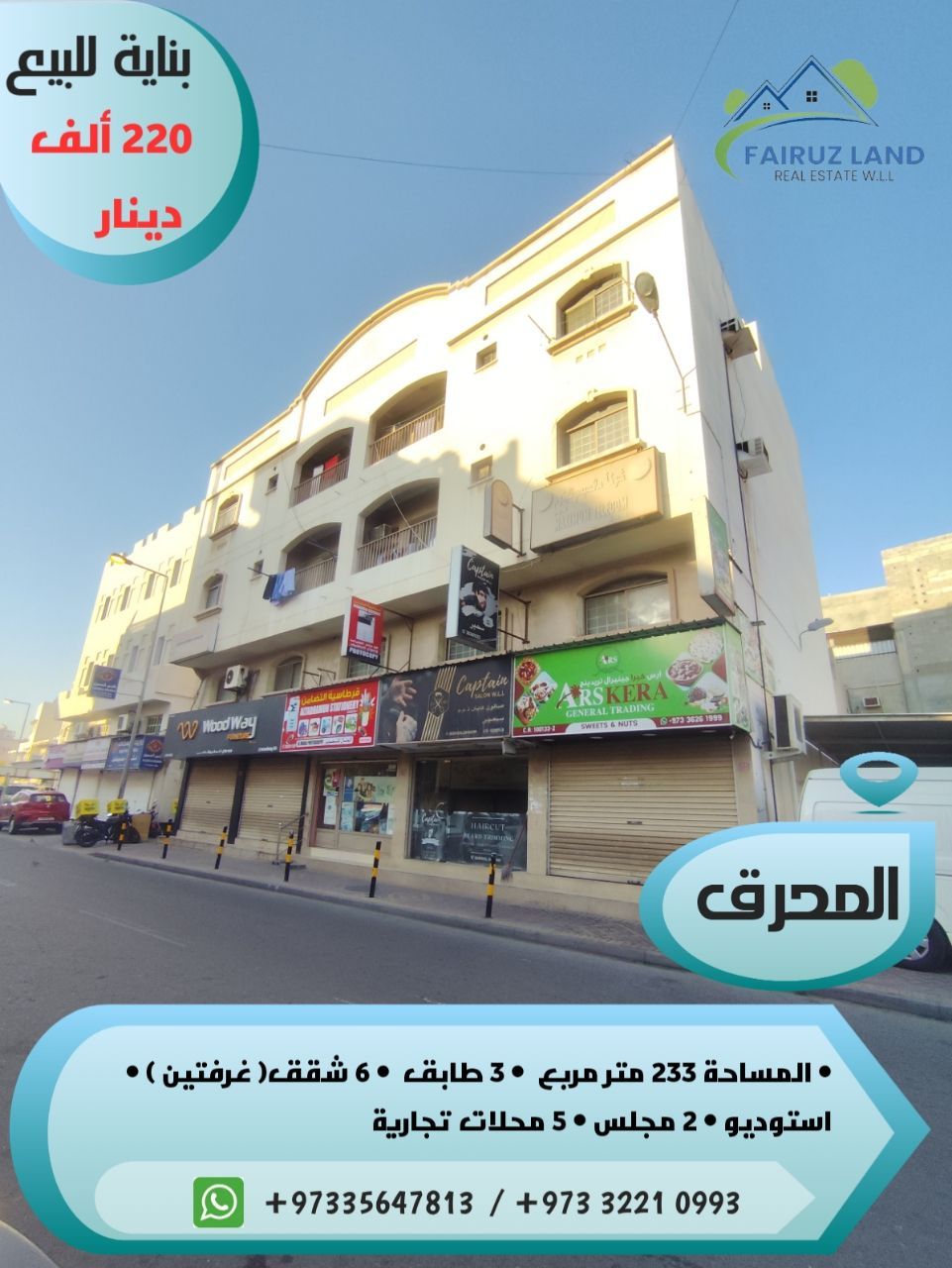 للبيع: عمارة استثمارية تجارية مميزة في المحرق على شارع تجاري. فرصة ممتازة للمستثمرين الباحثين عن دخل ثابت وعائد قوي. تفاصيل العقار: تتكون العمارة من 6 شقق، كل شقة تتكون من 2 غرف نوم، 2 حمامات، صالة، مطبخ، وبلكونة واحدة. يوجد استوديو في الطابق العلوي، 2 مجلس (ميزان)، و5 محلات تجارية. المساحة: 233 متر مربع. المدخول الشهري: 1,960 دينار بحريني. الدخل السنوي: حوالي 23,520 دينار. سعر البيع: 220,000 دينار بحريني.