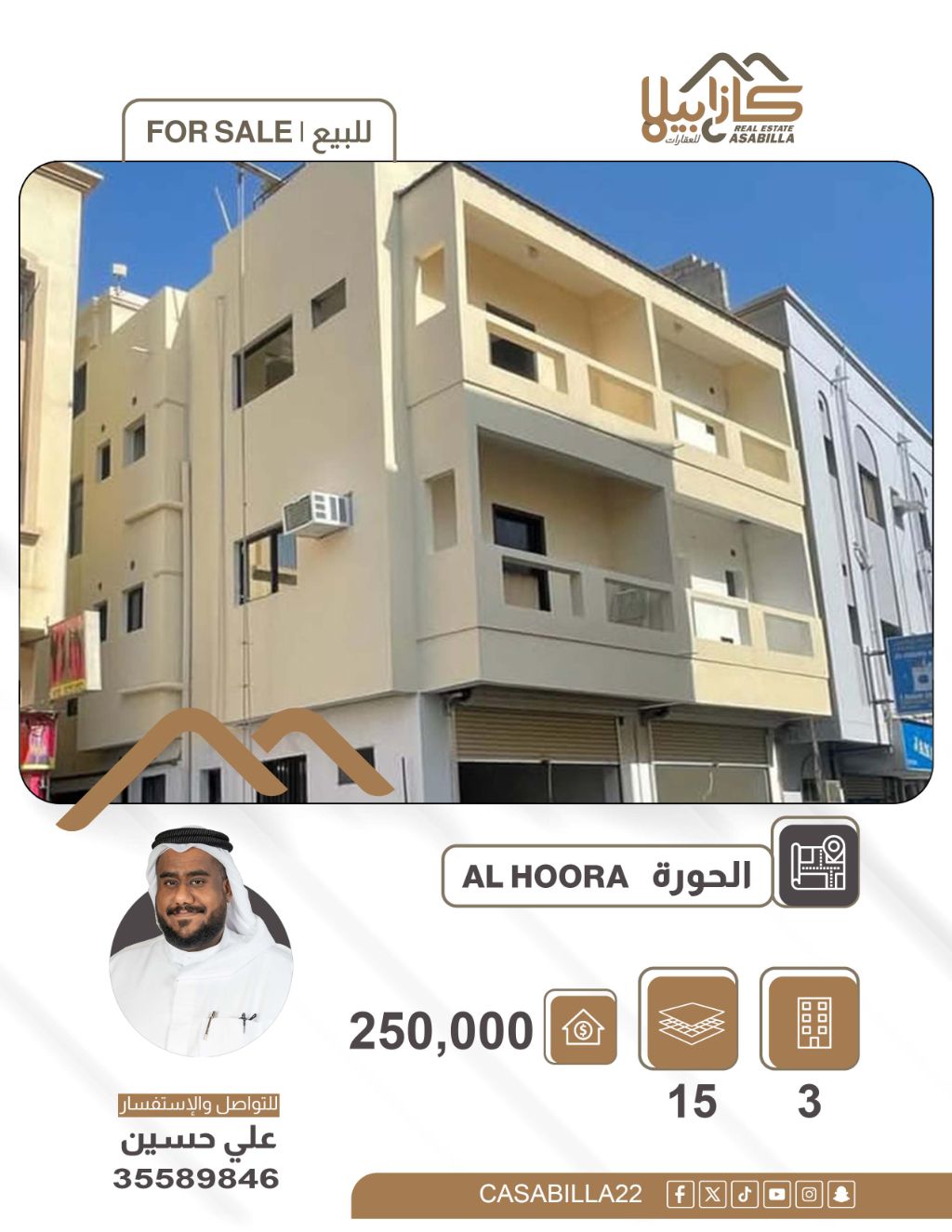 بناية تجارية للبيع في منطقة الحورة. فرصة استثمارية رائعة في قلب الحورة، بالقرب من شارع المعارض. المساحة: 173 متر مربع. المكونات: 2 محل تجاري، 15 شقة، 7 شقق غرفة وصالة، 8 شقق استوديو، 9 عدادات كهرباء مستقلة. السعر المطلوب: 250,000 دينار بحريني. الدخل الصافي: 2,000 دينار شهرياً. للتواصل والاستفسار، يرجى إرسال رسالة خاصة. فرصة ممتازة للاستثمار التجاري أو السكني في موقع مميز.