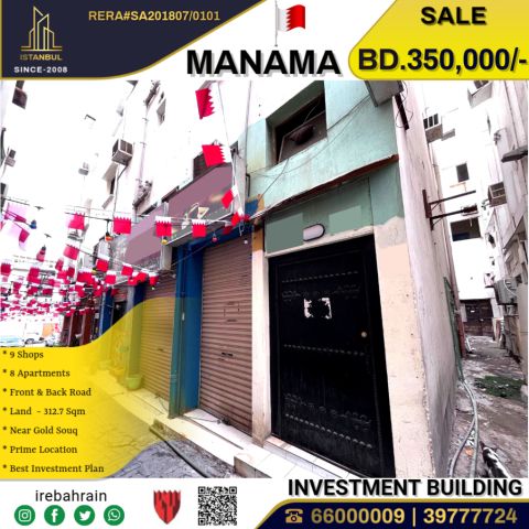 فرصة استثمارية - مبنى تجاري للبيع في المنامة مقابل 350000 دينار بحريني (قابل للتفاوض) موقع مميز مع عائد استثماري مرتفع. المبنى التجاري يتكون من 4 طوابق بالقرب من سوق الذهب، المنامة. 9 مصاريع واسعة - مثالية للأعمال والتجزئة. 8 شقق سكنية - طلب إيجار مرتفع. مساحة الأرض 312.7 متر مربع. استثمار ممتاز بعوائد كبيرة. سهولة الوصول الى المرافق المحلية ومراكز الأعمال. موقع استراتيجي - مثالي للمستثمرين وأصحاب