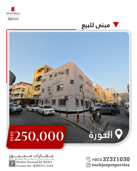 للبيع: بناية في الحورة 2، تحتوي على محل تجاري واحد، 11 شقة، 10 عدادات ماء، و10 عدادات كهرباء. مساحة الأرض 153 متر مربع، ومساحة البناء حوالي 489 متر مربع. السعر المطلوب 195,000 دينار بحريني. تواصل معنا لمزيد من المعلومات على 00973 - عقارات محجوز (Mahjoz Properties)، عقارات البحرين، أرض - للبيع، المنامة، البحرين.
