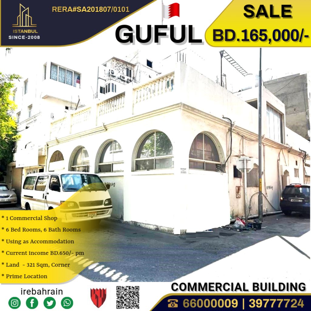 Building for sale in Al Qul - Prime location with stable income. Price 165000 Bahraini dinars (negotiable) Location Al Qul, corner property with a land area of 321 SQM. Current monthly income BD650 (from rented rooms and a shop) Features of the property A house with 6 bedrooms and one shop, currently rented to bachelors, providing a stable income. Corner ownership with access to two