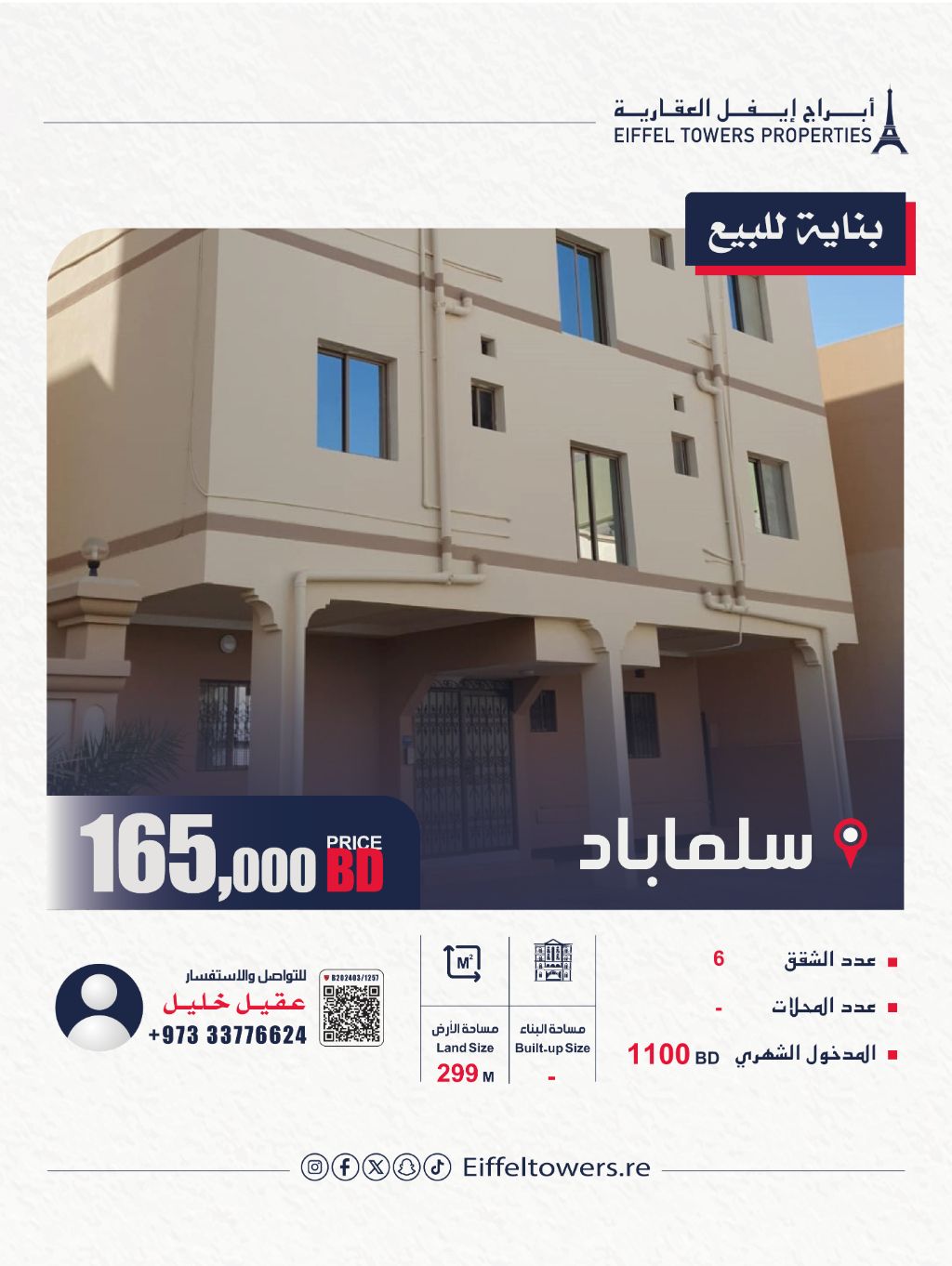 Eiffel Towers Real Estate Company offers for sale a building in Salmabad. The land area is 299 square meters, and the building area is 820 square meters. It consists of 6 apartments with a total income of 1100 BD. The ground floor has a large apartment with 4 bedrooms, 3 bathrooms, a large living room, and a large kitchen. The first floor has two apartments, each with 2 bedrooms, 3 bathrooms, a living room, and a kitchen. The second floor has two apartments, each with 2 bedrooms, 3 bathrooms, a living room, and a kitchen. The third floor has a studio apartment. The sale price is 165,000 BD. For contact: Aqeel Khalil.