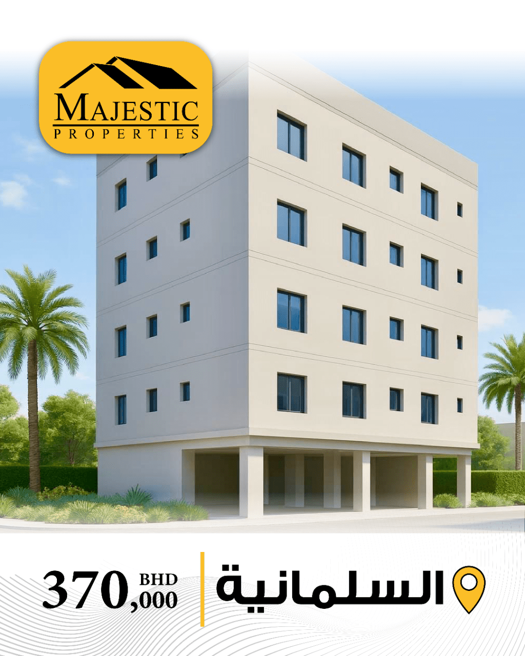 For sale: A new residential building in Salmaniya, a prime location near Salmaniya Hospital. It consists of 11 apartments: 9 two-bedroom apartments, 2 studio apartments, an elevator, 11 car parking spaces, and 11 electricity meters. The land area is 232 square meters, and the built-up area is 829.5 square meters. The monthly income is 2,500 Bahraini dinars (rented to individuals). The asking price is 370,000 Bahraini dinars, negotiable. Reference: MPM3221. For more information.