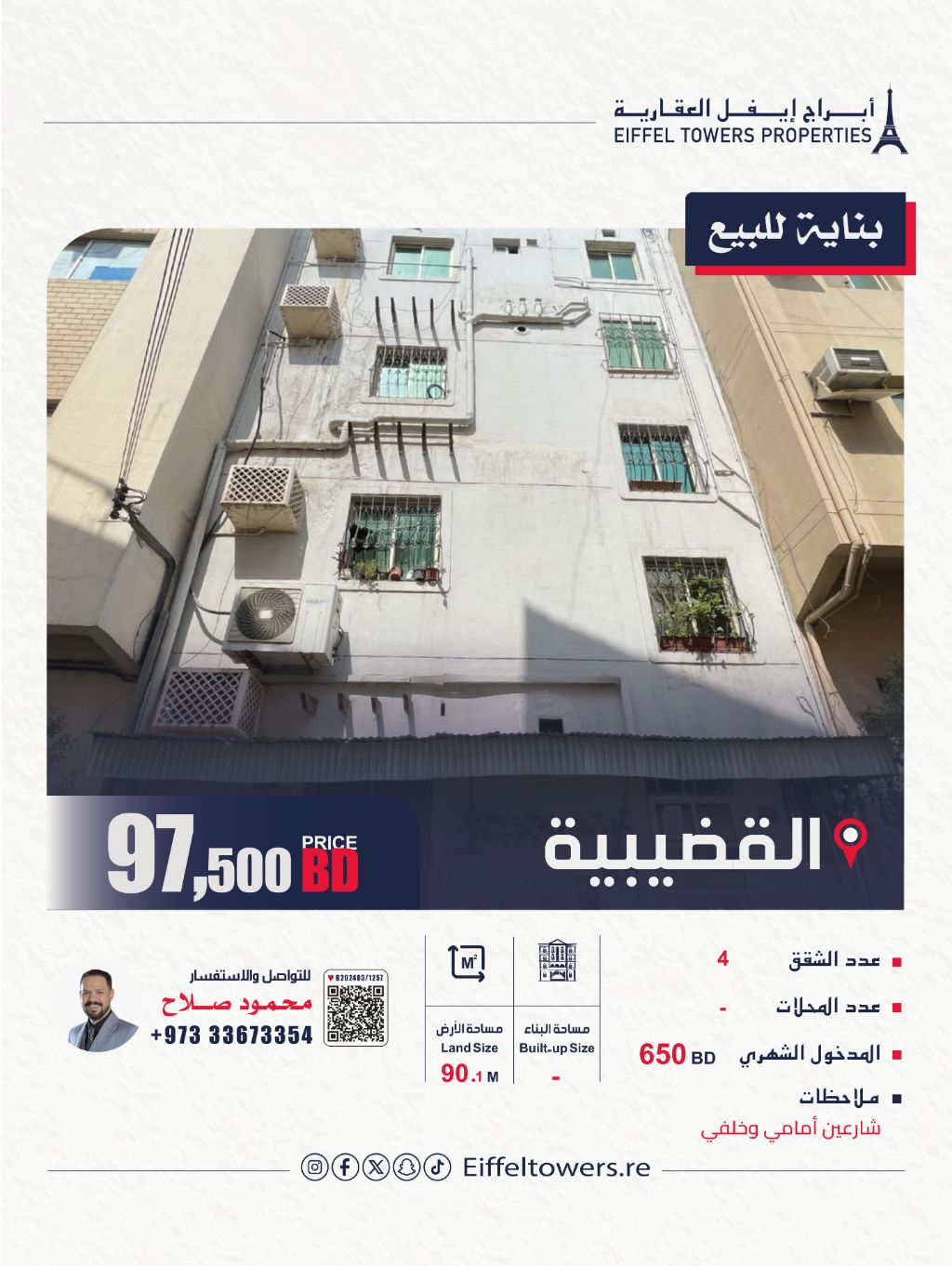Eiffel Towers Real Estate Company is selling a building in Al Qudaibiya. The land area is 90.1 square meters. Details of the building: 4 floors, 4 apartments. Each apartment consists of 3 bedrooms, a living room, a kitchen, and 2 bathrooms. It has front and back street access. The net income is 650 BD. The total price is 97,500 BD. For contact: Mahmoud Salah.