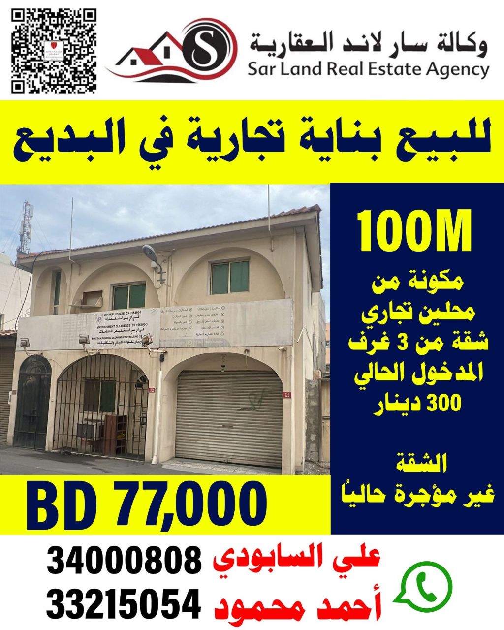 A single-family building in Al-Budaiya with an excellent location, an area of 100 square meters, current income of 300 dinars, and the apartment is currently not rented. Price is 77,000 dinars.