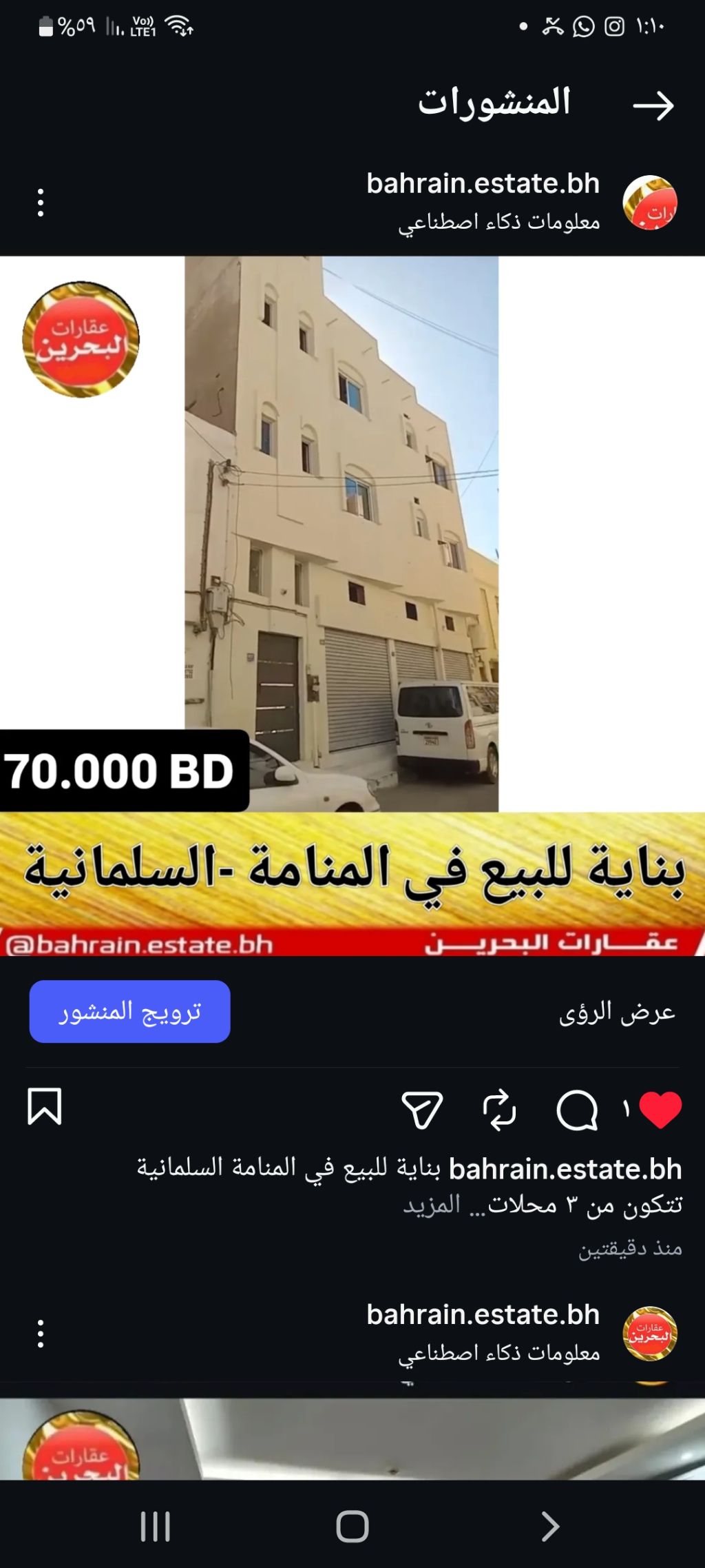 A building for sale in Manama, Salmaniya, consisting of 3 shops and 2 apartments, each apartment contains 3 rooms, land area 74 square meters, price only 70 thousand.