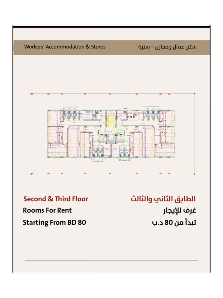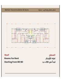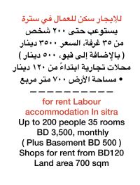 للإيجار: سكن للعمال في سترة، يستوعب حتى 200 شخص من 35 غرفة. السعر: 3500 دينار (بالإضافة إلى قبو: 500 دينار). محلات تجارية للإيجار ابتداءً من 120 دينار. مساحة الأرض: 700 متر مربع.