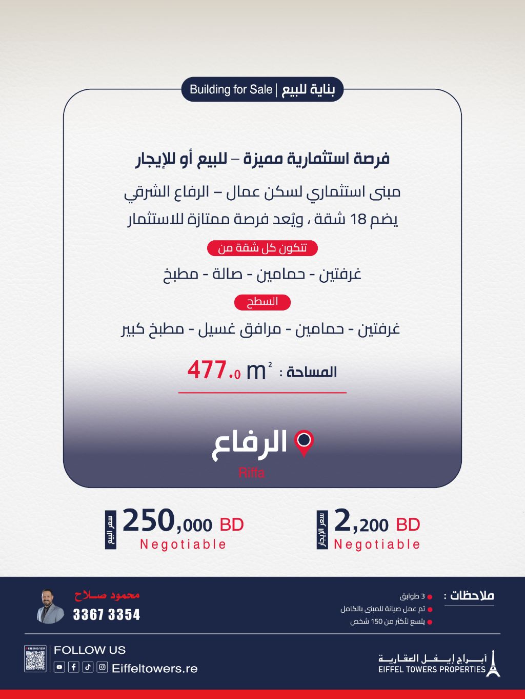 شركة أبراج أيفل العقارية للبيع أو الإيجار: بناية استثمارية في الرفاع الشرقي. مساحة الأرض: 477 متر مربع. تفاصيل البناية: 3 طوابق، 18 شقة. كل شقة تتكون من 2 غرف نوم، صالة، مطبخ، وحمامين. السطح يتكون من غرفتين، حمامين، مطبخ كبير، ومرافق للغسيل. المبنى مكون من 3 طوابق وتم عمل صيانة كاملة. يتسع لأكثر من 150 شخص. سعر الإيجار: 2000 دينار بحريني. سعر البيع: 250,000 دينار بحريني. للتواصل: محمود الصادق، eiffeltowers - re.