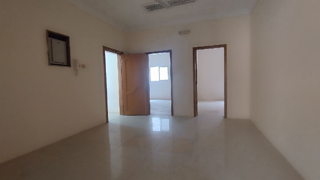 Sanabis 3BHK unfurnished flat for rent. BD260 with unlimited EWA. Hall, 3 bedrooms, 2 bathrooms, and closed kitchen. Reference number K260402. Contact for details