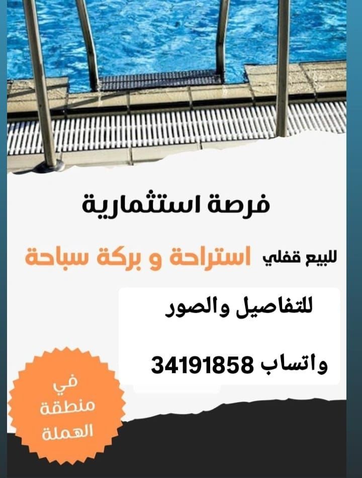 للبيع: قفلي استراحة في مزارع بوري قرب المحجر. لها زبائنها وذات مدخول طيب. تحتوي على بركتين سباحة للكبار والصغار، وصالة كبيرة جداً، ومجلس رجالي، وغرفة نوم مع حمام، وجلسة، وحمامان، وشاور خارجي، ومطبخ، ومخزن، ومساحة ألعاب للأطفال، وغرفة خارجية للحارس مع حمام، ومكان للشواء. الجرنيتر بحالة ممتازة. العقد لمدة 10 سنوات، تبقى منه 5 سنوات تقريباً، وقابل للتمديد لـ 10 سنوات أخرى. الإيجار الشهري للأرض 200 دينار. مساحة الاستراحة 570 متر مربع.
