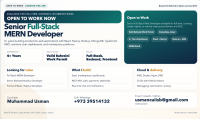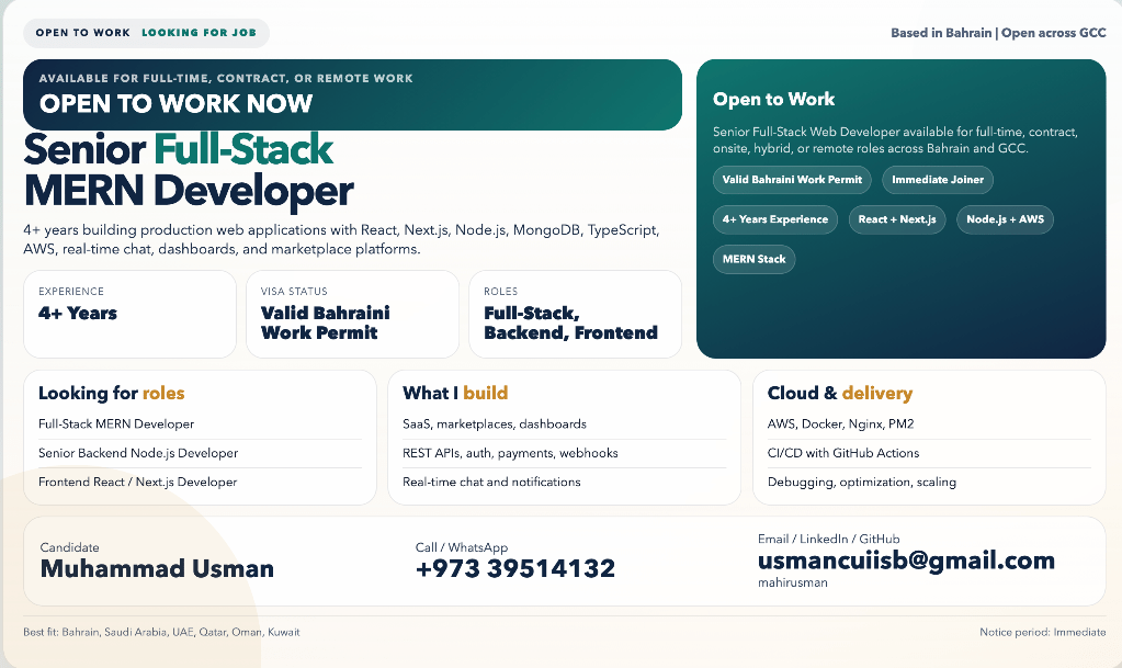 Senior Full-Stack MERN Developer Open to Work in Bahrain. Senior Full-Stack Web Developer with 4+ years of experience building and scaling production web applications using React, Next.js, Node.js, Express, NestJS, MongoDB, TypeScript, Redis, Socket.io, and AWS. Experienced in full end-to-end development including frontend UI, backend APIs, database design, authentication, and authorization.