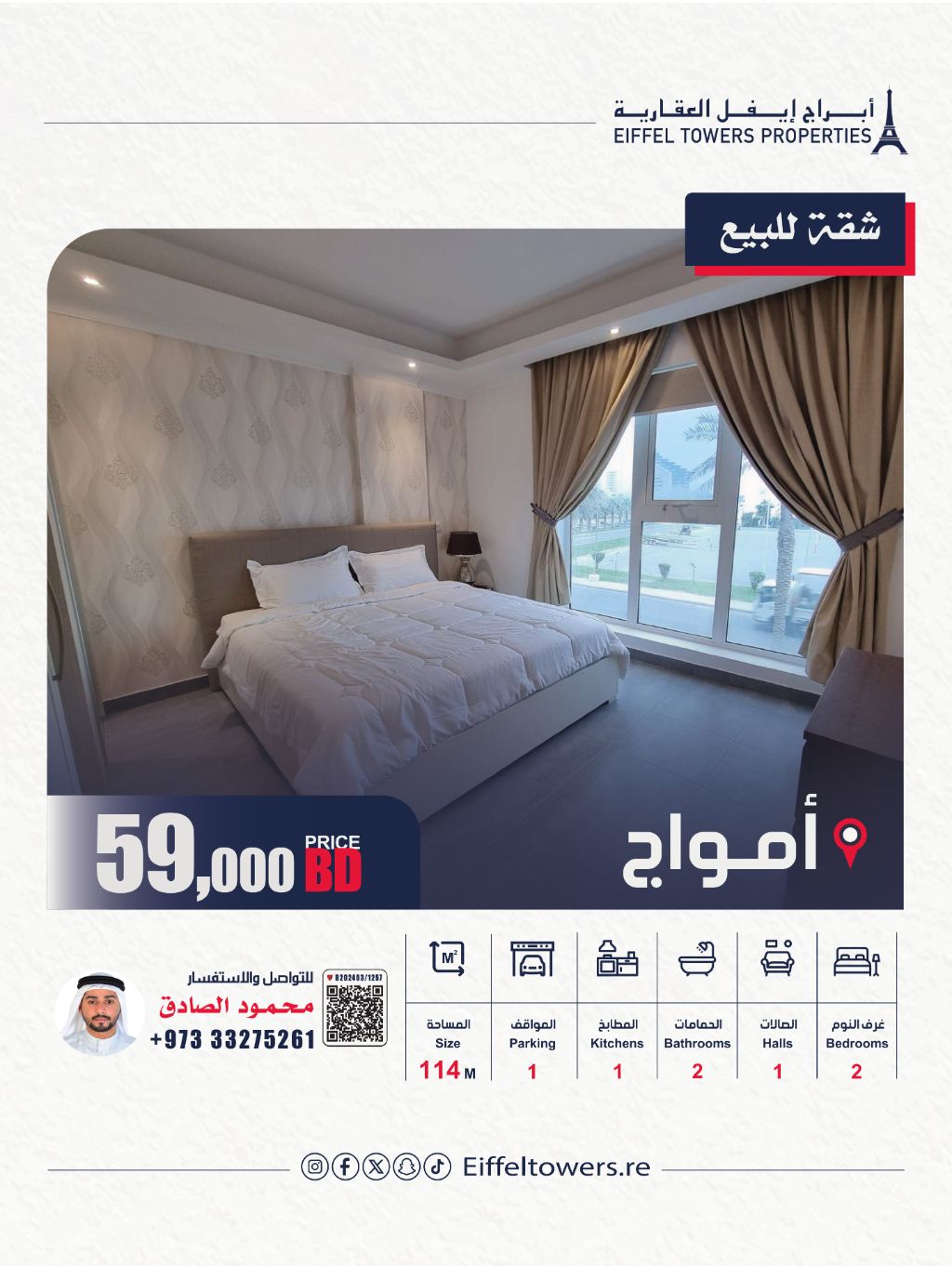 شركة أبراج أيفل العقارية تعرض للبيع شقة في أمواج مارينا ريزيدنس. مساحة الشقة 114 متر مربع. تفاصيل الشقة: غرفتين نوم، صالة واحدة، مطبخ واحد، حمامان. المرافق والخدمات تشمل موقف سيارات، بلكونة، بركة سباحة، ونادي صحي. الشقة مفروشة وقريبة من جميع الخدمات. السعر الإجمالي 59000 دينار بحريني. للتواصل: محمود الصادق.