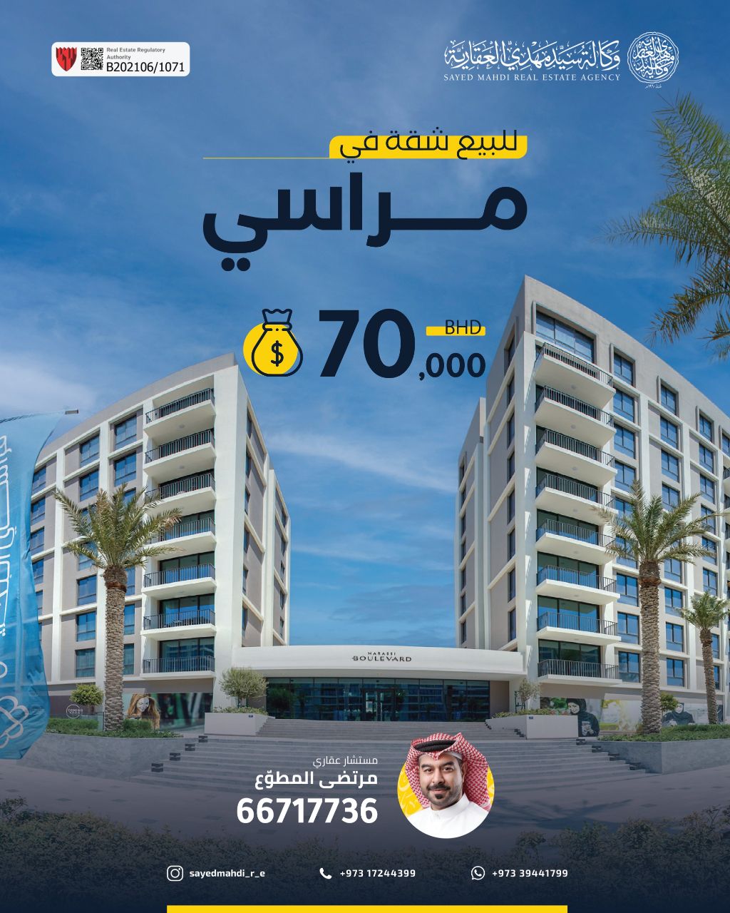 للبيع شقة سكنية في ديار المحرق تقع في مراسي تتكون من صالة - مطبخ - حمامين - غرفة نوم - غرفة غسيل - موقف خاص لسيارة السعر الاجمالي 70000 دينار بحريني لمزيد من التفاصيل وسيط عقاري معتمد مرتضى المطوع وكالة سيد مهدي العقاريه RERA SA 202307/ 1206 sayedmahdi - r e mortadha - smre