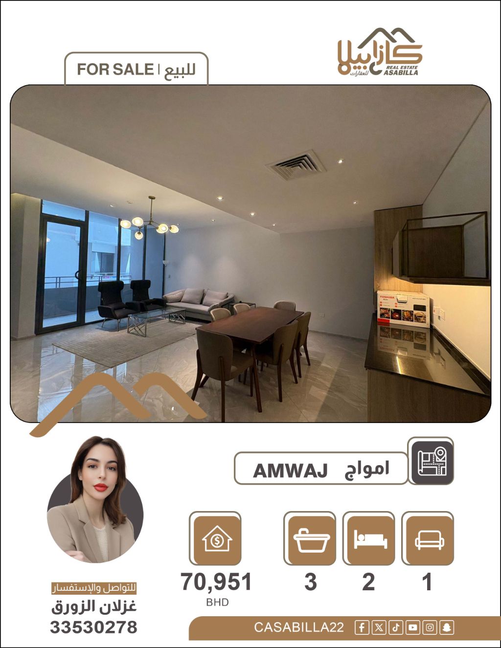 شقة للبيع في منطقة أمواج. شقة متميزة للبيع في جزر أمواج. استثمر في الرفاهية بامتلاك شقة واسعة في واحدة من أرقى الوجهات البحرية في البحرين. تتميز الشقة بتصميم ذكي يجمع بين المساحة الكبيرة والخصوصية، مع مزايا نادرة مثل المطبخ المزدوج وغرفة الغسيل المستقلة. غرفتين + غرفة غسيل، مطبخين (واحد مفتوح وواحد مغلق)، صالة، ثلاثة حمامات، بلكونة. السعر: 70,951.00، المساحة: 114.70. للتواصل.