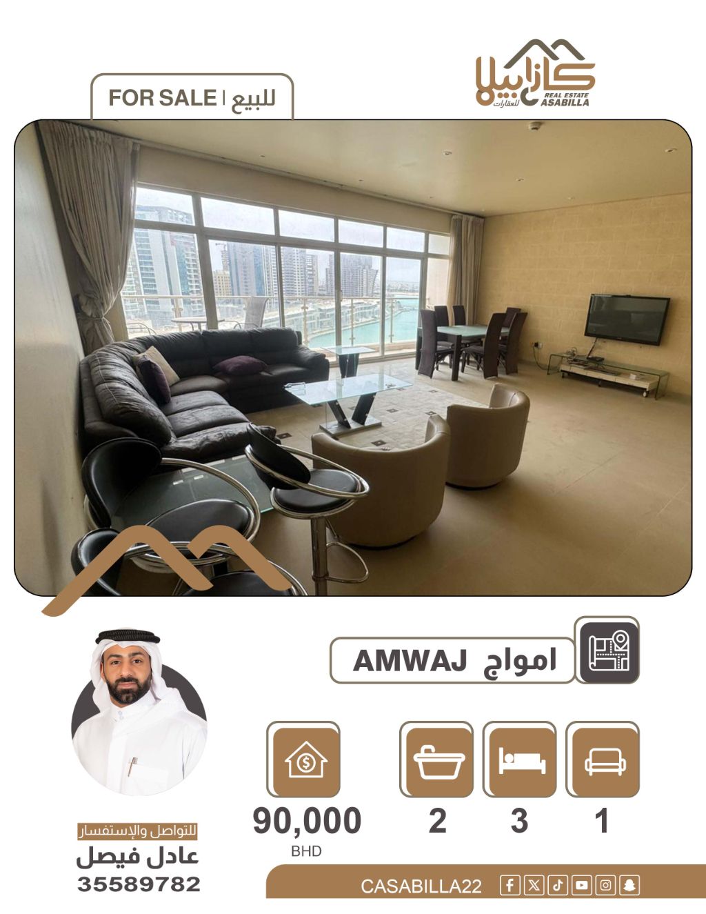 للبيع - شقة مميزة في أمواج باطلالة جميلة على اللاجون في موقع هادئ وراقي. تفاصيل الشقة: 3 غرف نوم - حمامين - صالة واسعة - مطبخ - بلكونة باطلالة على اللاجون. سعر البيع: 90,000 دينار (قابل للتفاوض). للتواصل والاستفسار.