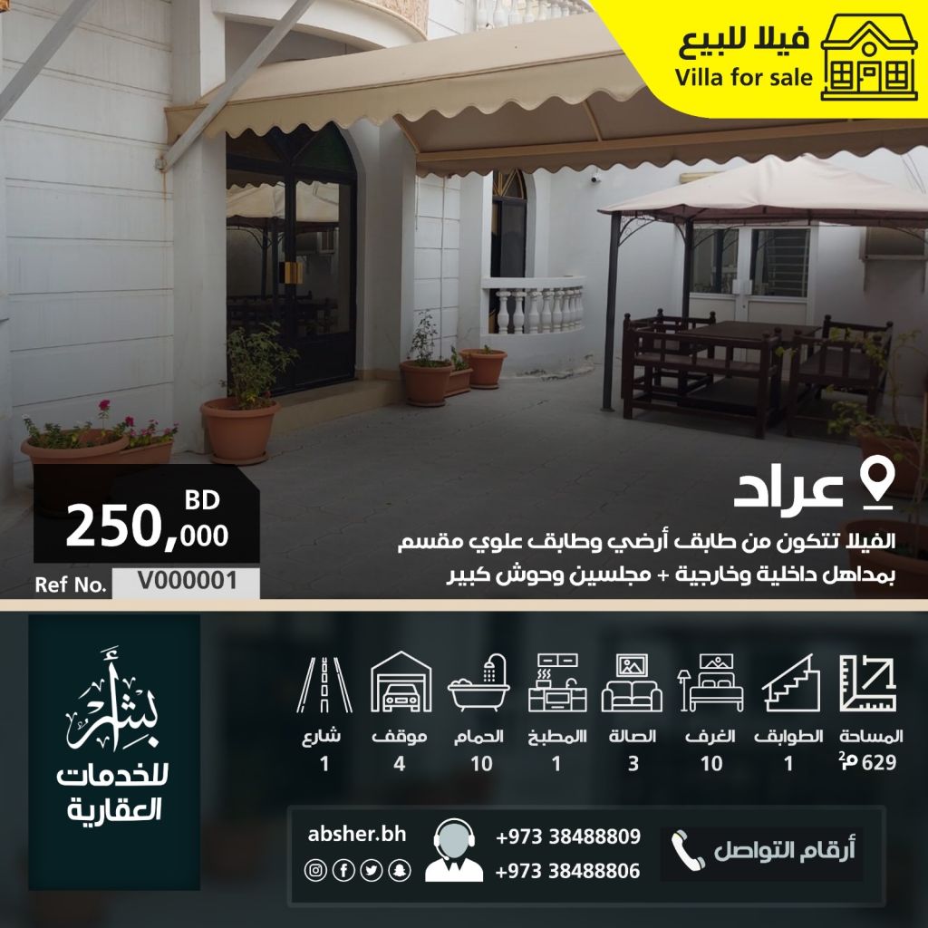 For sale, a villa in Arad, complex (244) with a land area of 629 SQM. It consists of a ground floor and an upper floor, divided with internal and external family entrances, along with side corridors, a large courtyard, parking for four cars inside, an external kitchen and toilet, and a laundry room. The Villa comprises 10 rooms, 10 bathrooms, 3 halls, and 2 Majlis. The price is 250000 Bahraini