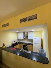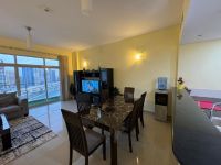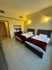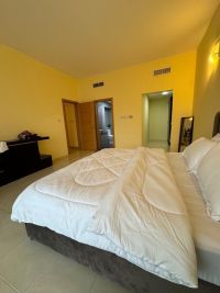 For rent or sale, an apartment in Amwaj Islands with two bedrooms, one of which is a master bedroom with its own bathroom and dressing room, a spacious living room, an open kitchen, two bathrooms, a laundry room, and a furnished balcony. Located on the tenth floor with a wonderful view of the lagoon. The requested rent is 400 dinars, and the sale price is 58000 dinars. Services include reception