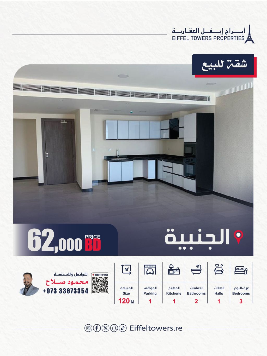 Eiffel Towers Real Estate Company offers for sale an apartment in Al Janabiyah. The apartment area is 120 square meters. Details of the apartment: number of rooms is 3, number of halls is 1, number of kitchens is 1, number of bathrooms is 2. Facilities and services include a parking space and proximity to all services. The total price is 62,000 Bahraini dinars. For contact: Mahmoud Salah.