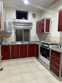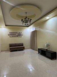 An apartment for sale in Riffa East, with an area of 150 square meters, featuring three bedrooms, three bathrooms, a maid's room, a spacious living room, and a kitchen. It is on the ground floor, with service fees of only 15 dinars. Located near amenities, priced at 52,000 dinars. For contact.