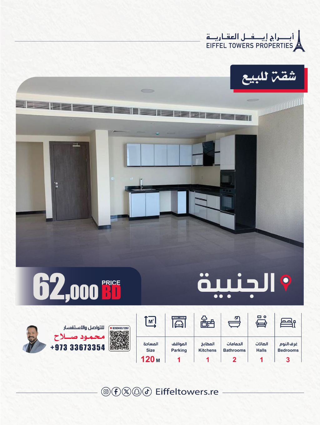 Eiffel Towers Real Estate Company offers for sale an apartment in Janabiya. The apartment area is 120 square meters. Details of the apartment: number of rooms 3, number of living rooms 1, number of kitchens 1, number of bathrooms 2. Facilities and services: parking, close to all services. Total price: 62,000 Bahraini dinars. For contact: Mahmoud Salah, eiffeltowers.re, eiffeltowers.re, a broker licensed by the Real Estate Regulatory Authority, license number B202403/1257.