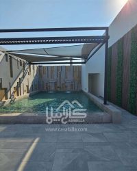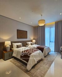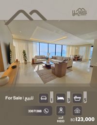 An apartment for sale in Al Hidd, consisting of 3 spacious bedrooms + a maid's room + 5 bathrooms + a luxurious and spacious kitchen. Each apartment enjoys a full sea view from the front and back. Price 123,000.