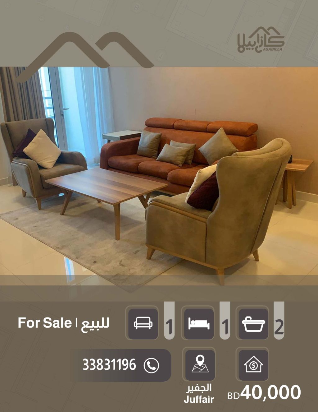 An investment apartment in the heart of Juffair for sale. An excellent opportunity for investors. The apartment is rented and in a strategic location in Juffair. It consists of a bedroom, living room, two bathrooms, kitchen. Facilities include a swimming pool, jacuzzi, sauna, and a fitness club. Price: 40,000 Bahraini dinars only. Immediate income from rent. For contact and inquiries.