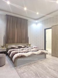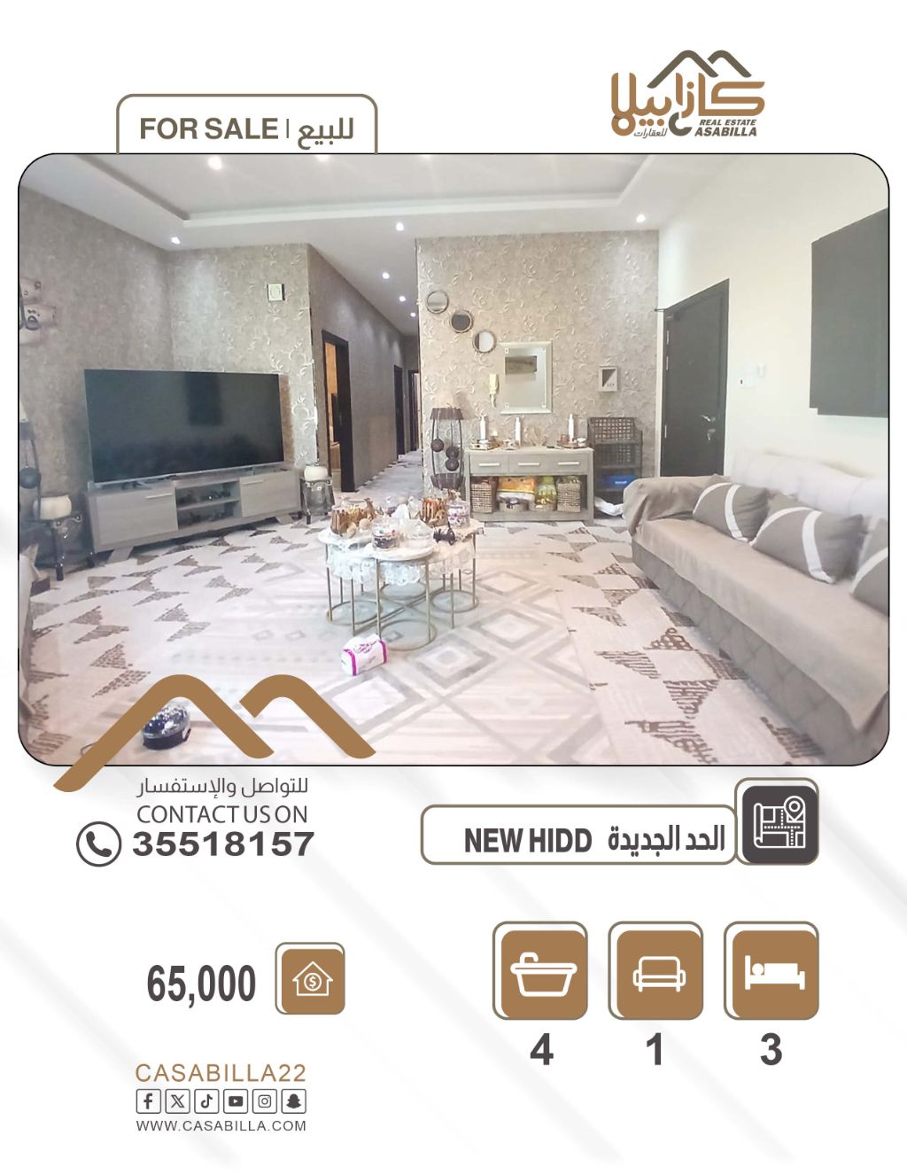 For sale: A luxurious furnished apartment in the Al-Hadd New Area, consisting of 3 bedrooms, a maid's room, 4 bathrooms, a living room, and a kitchen. It has an elevator and parking spaces. The area is 130 square meters. The price is 65,000 dinars, negotiable. For inquiries.
