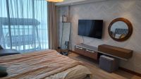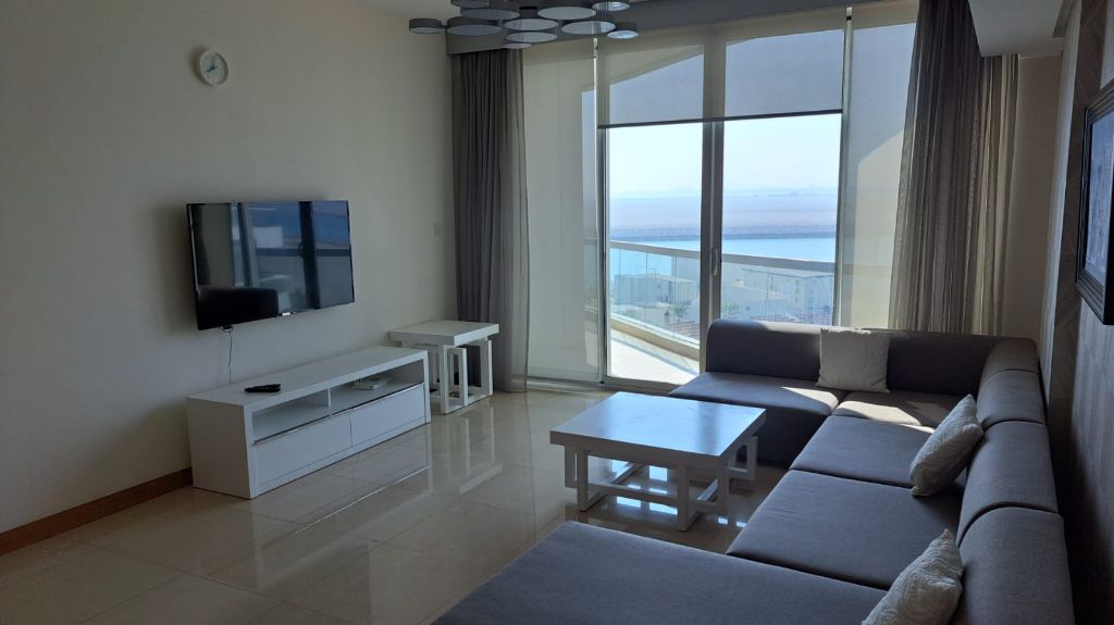 For sale: A fully furnished residential apartment in Dilmunia Island, consisting of a bedroom, kitchen, spacious living room, two bathrooms, and a balcony. Services include a gym, swimming pool, meeting room, cinema, children's play area, parking spaces, etc. Price: 58,000 Bahraini dinars.