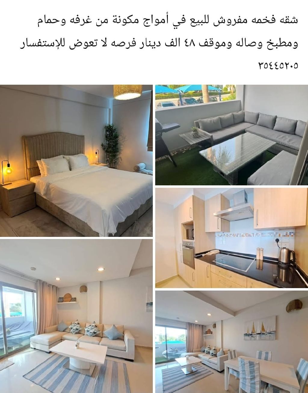 A luxurious furnished apartment for sale in Amwaj, consisting of one bedroom, a kitchen, a bathroom, a living room, and a parking space, priced at 48,000 dinars. An unmissable opportunity.