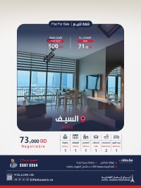 Eiffel Towers Real Estate Company offers for sale or rent an apartment in Seef with a stunning sea view. The apartment area is 71 square meters. Details of the apartment: number of rooms 1, number of halls 1, number of kitchens 1, number of bathrooms 2. Facilities and services: parking, fully furnished, 14th floor, fully equipped kitchen, high-speed internet, close to all services. Total price: 73,000 Bahraini dinars. Rental price: 500 Bahraini dinars including electricity and water. For contact: Mahmoud Salah, eiffeltowers-re.