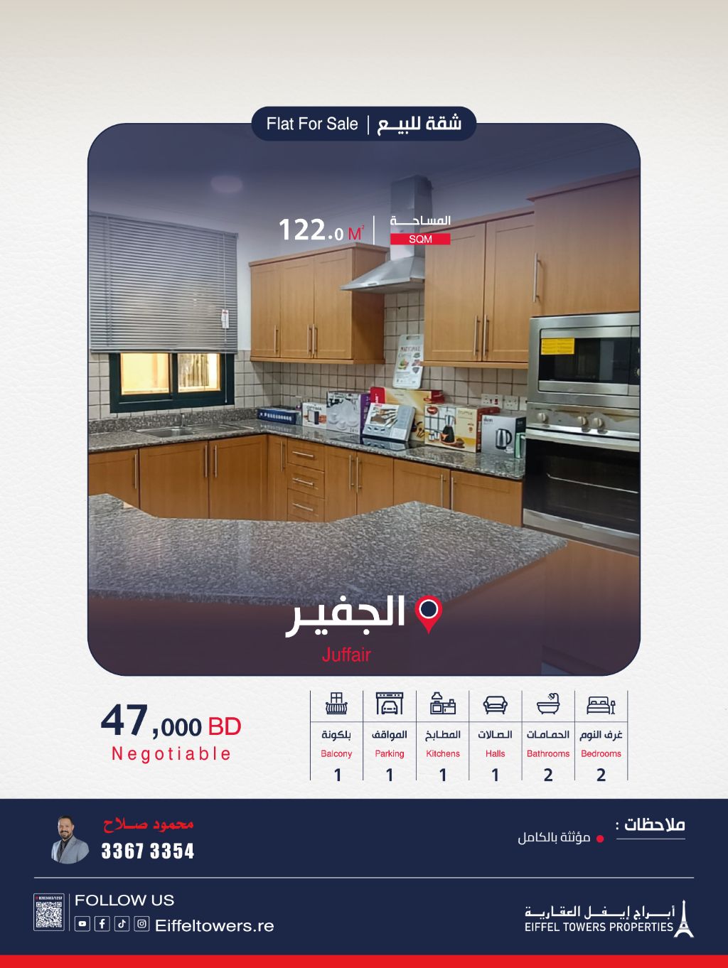 Eiffel Towers Real Estate Company for sale: An apartment in Al Juffair. Apartment area: 122 sqm. Apartment details: 2 bedrooms, 1 living room, 1 kitchen, 2 bathrooms. Facilities and services: Parking, sauna, swimming pool, gym, fully furnished, 24-hour security, close to all services. Total price: 47,000 BD. For contact: Mahmoud Salah, eiffeltowers.re, eiffeltowers.re, a broker licensed by the Real Estate Regulatory Authority, license number B202403/1257.