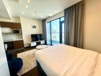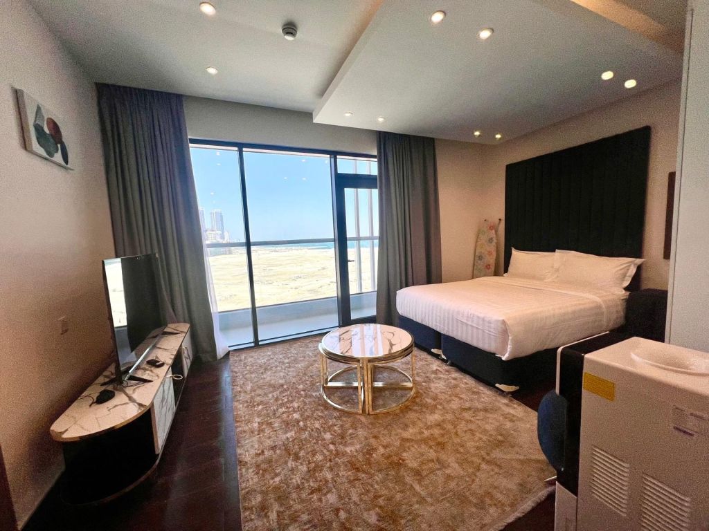 شقة استوديو فاخرة مفروشة بالكامل للإيجار في الجفير. تحتوي الشقة على شرفة مطلة على البحر. تشمل المرافق مسبحا وصالة ألعاب رياضية وغرفة بخار وساونا وسينما وسكواش وغرف ألعاب وغير ذلك الكثير. الإيجار 280 دينارا بحرينيا، بما في ذلك 20 دينارا بحرينيا لرسوم الكهرباء والماء. يرجى الاتصال