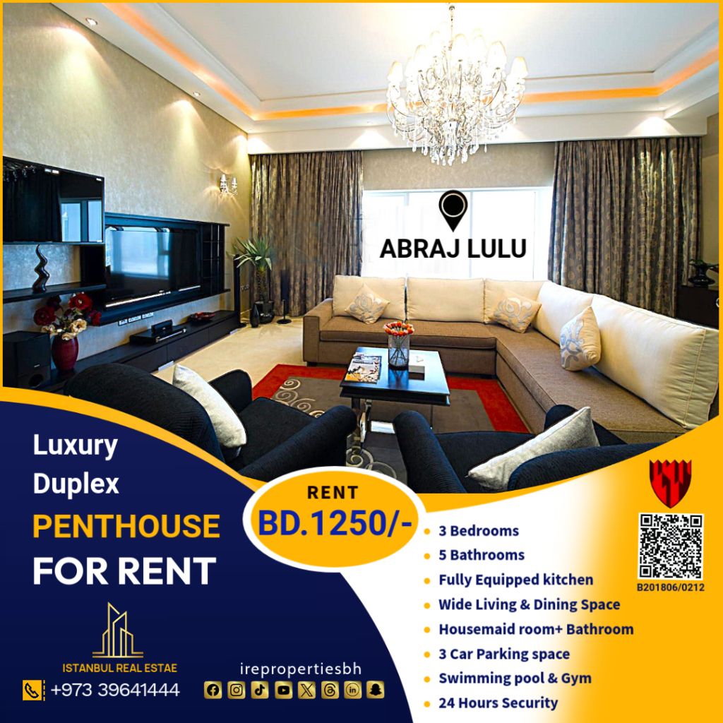 دوبلكس بنتهاوس فاخر للإيجار في أبراج اللولو. 1250 دينار بحريني. يقع هذا البنتهاوس الفاخر في منطقة المنامة السويفية. تفاصيل العقار 3 غرف نوم 5 حمامات - مساحة معيشة وطعام واسعة - مطبخ مجهز بالكامل غرفة خادمة مع حمام - خزائن مدمجة - تكييف مركزي، شرفة - 3 مواقف سيارات مغطاة - أمن على مدار 24 ساعة - صالة ألعاب رياضية مشتركة وحمام سباحة. ستحب هذا المنزل الرائع الذي يقع في وسط جميع المرافق مثل المحلات